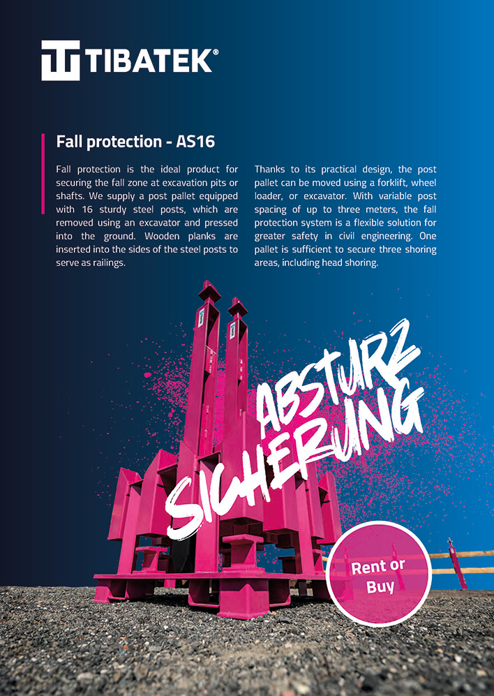 Fall protection is the ideal product for securing the fall zone at excavation pits or shafts. We supply a post pallet equipped with 16 sturdy steel posts, which are removed using an excavator and pressed into the ground. Wooden planks inserted into the sides of the steel posts serve as railings.