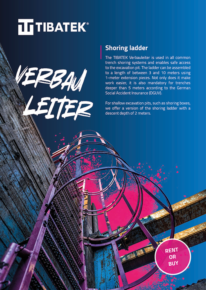 The TIBATEK shoring ladder is used in all standard trench shoring systems and enables safe access to the excavation pit. The ladder can be mounted with extension pieces of 1 meter each to a length between 2 and 10 meters. It is not only a useful aid to work, but is also mandatory from a trench depth of 5 m according to the German Social Accident Insurance (DGUV).